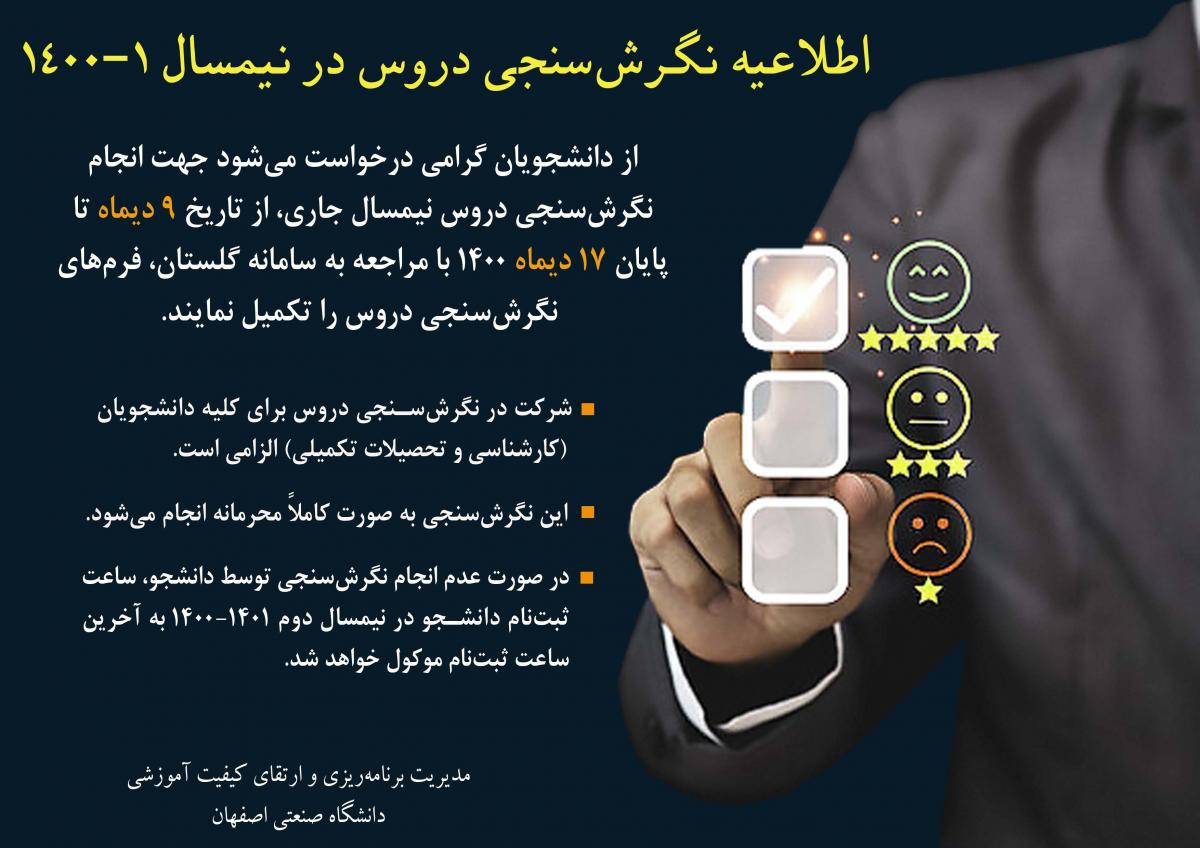 نگرش‌سنجی دروس در نیمسال تحصيلي 1-1400، انشاءالله از تاريخ 9 ديماه تا پايان 17 ديماه 1400 انجام خواهد شد. از دانشجويان عزیز درخواست می‌شود با مراجعه به سامانه گلستان در اين بازه، فرم‌هاي نگرش‌سنجي دروس را تكميل نمايند. لازم به ذكر است، شركت در نگرش‌سنجي دروس براي كليه دانشجويان (كارشناسي و تحصيلات تكميلي) الزامي است. همچنين، این نگرش‌سنجي به صورت کاملاً محرمانه انجام خواهد شد.