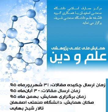 گفتنی است: همایش ملی علم ودین به همت مرکز معارف اسلامی و ادبیات فارسی دانشگاه صنعتی اصفهان و گروه فلسفه علم دانشگاه صنعتی شریف اواخر بهمن ماه سال جاری در دانشگاه صنعتی اصفهان برگزار خواهد شد.