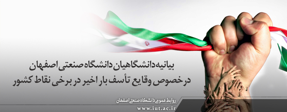 دانشگاهیان دانشگاه صنعتی اصفهان، در کنار دیگر آحاد مردم و علاقه مندان به نظام و کشور، ضمن اعلام انزجار از تحرکات اغتشاشگران در تعرض به قانون، امنیت و منافع ملی، ازدلسوزان کشور و نظام می خواهند که با حفظ هوشیاری در قبال وقایع اخیر، دشمنان و عمّال داخلی آنان را در پیاده کردن نقشه های شوم خود ناکام گذارده و دستیابی به مطالبات بحق مردمی در سایه امنیت، آسایش و قانونمندی را پیگیری نمایند.
