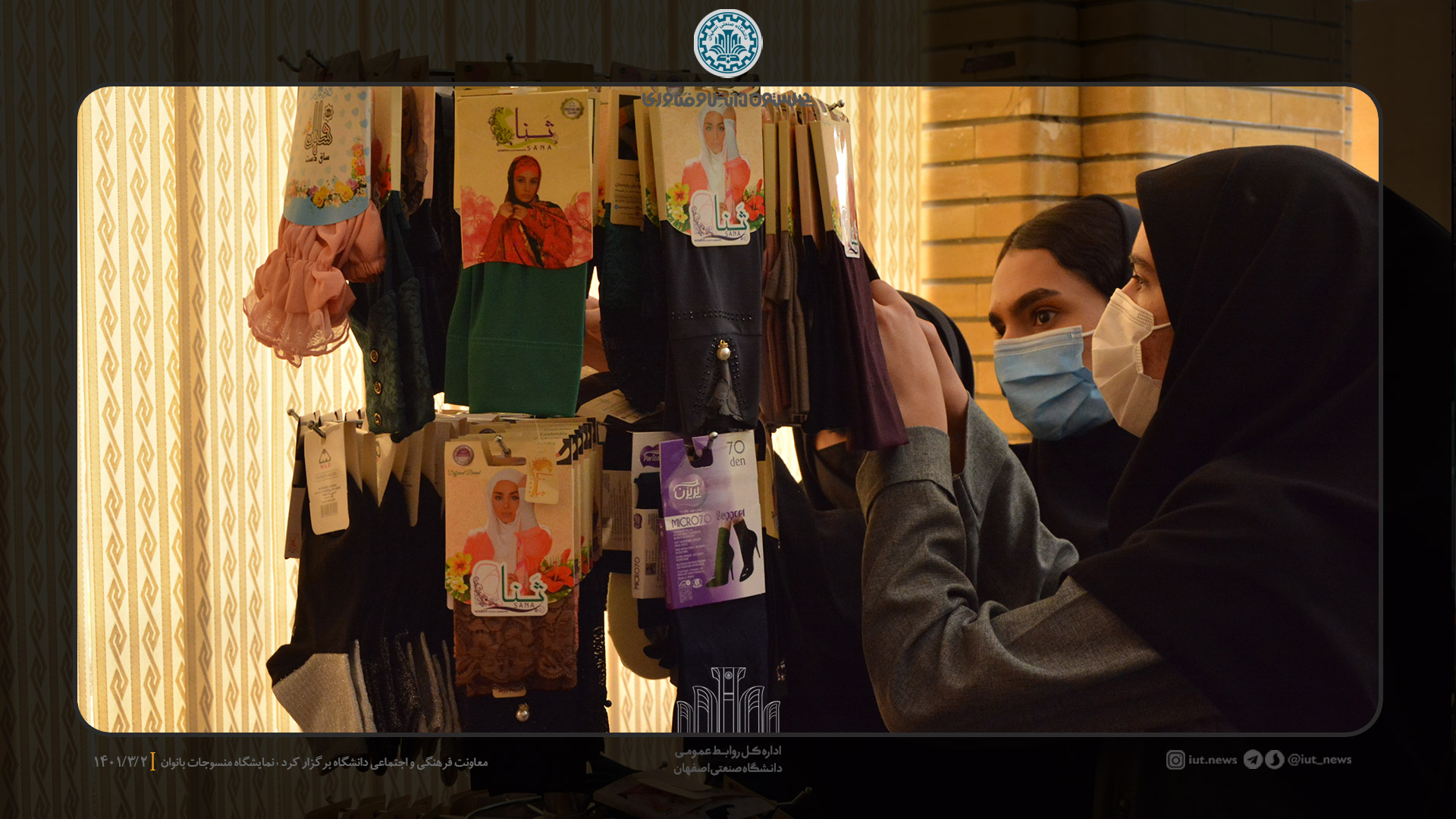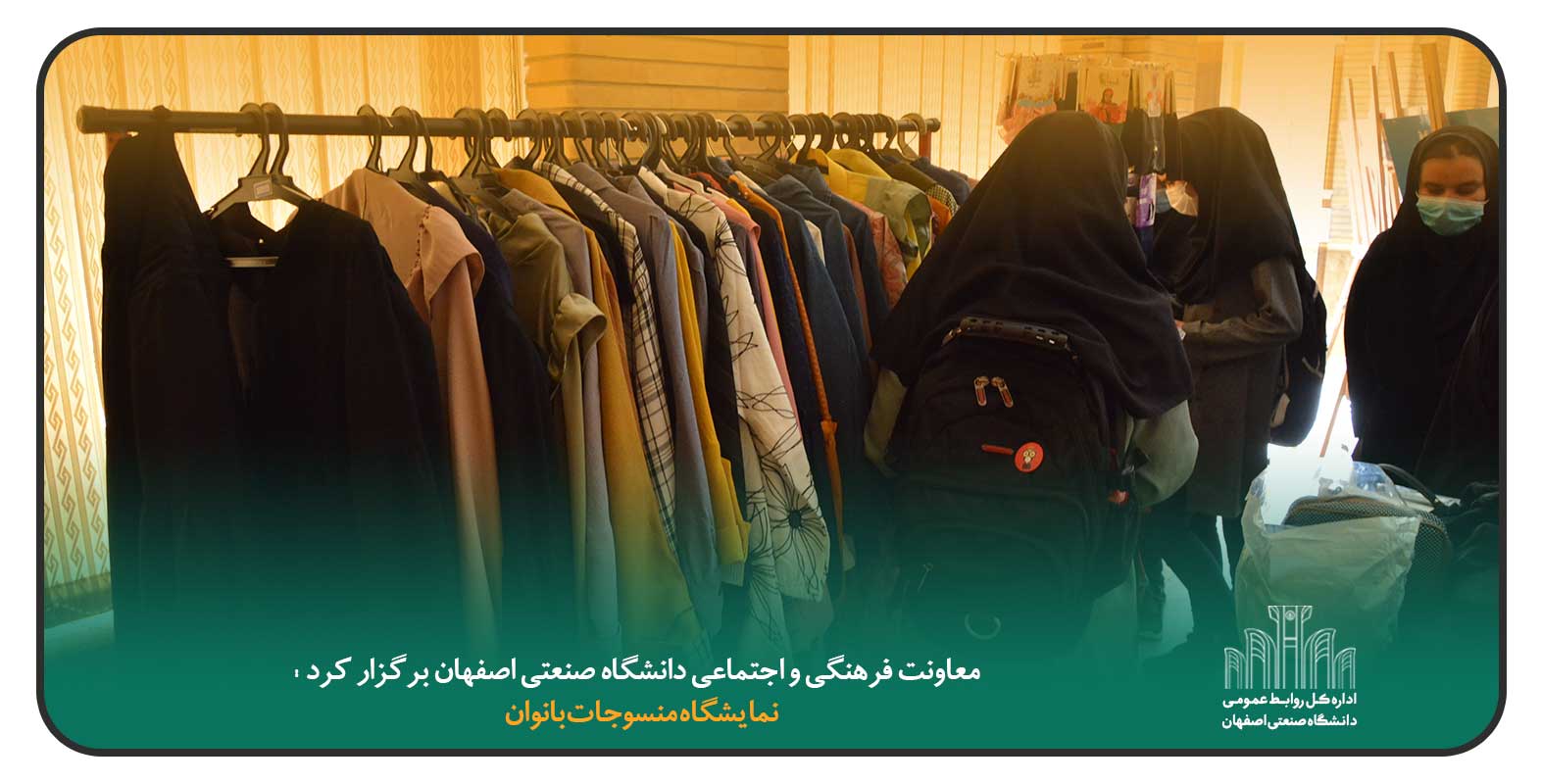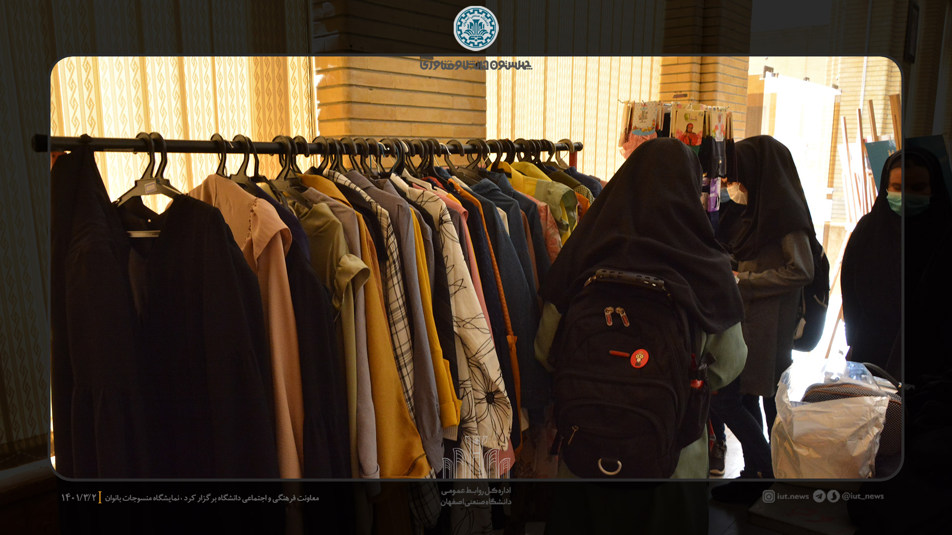 معاونت فرهنگي و اجتماعي دانشگاه صنعتي اصفهان، نمايشگاه منسوجات بانوان را با هدف ارايه پوشاك مناسب دختران و بانوان دانشگاهي،  از تاريخ 1 تا 4 خرداد ماه در سالن شهيد همت برگزاركرد. در اين نمايشگاه و فروشگاه، پوشاك فصل، مانتو، روسري، مقنعه، چادر و... باكيفيت و قيمت مناسب دانشجويي عرضه شد.
