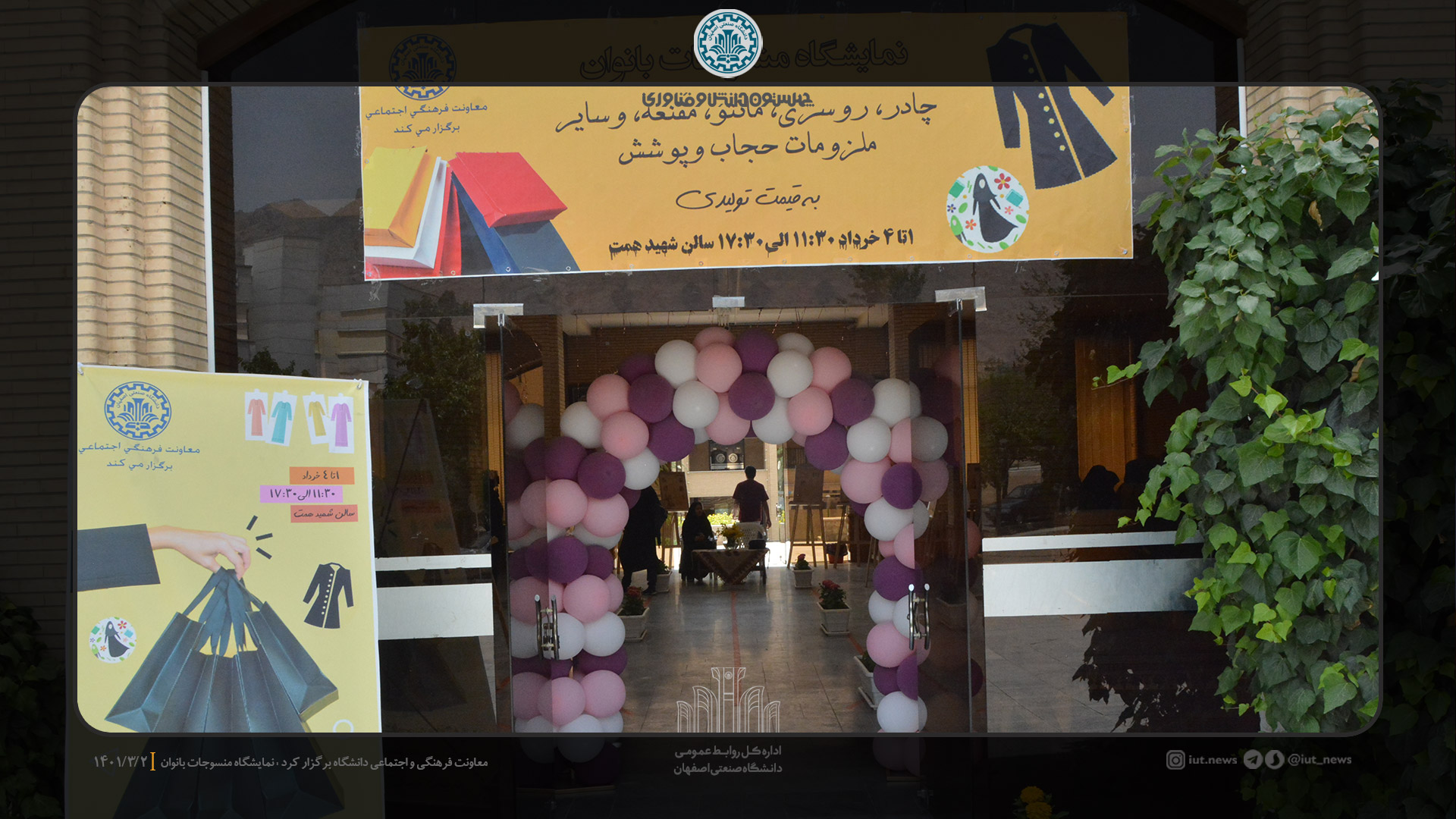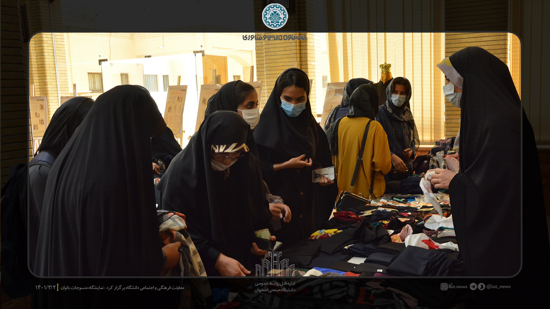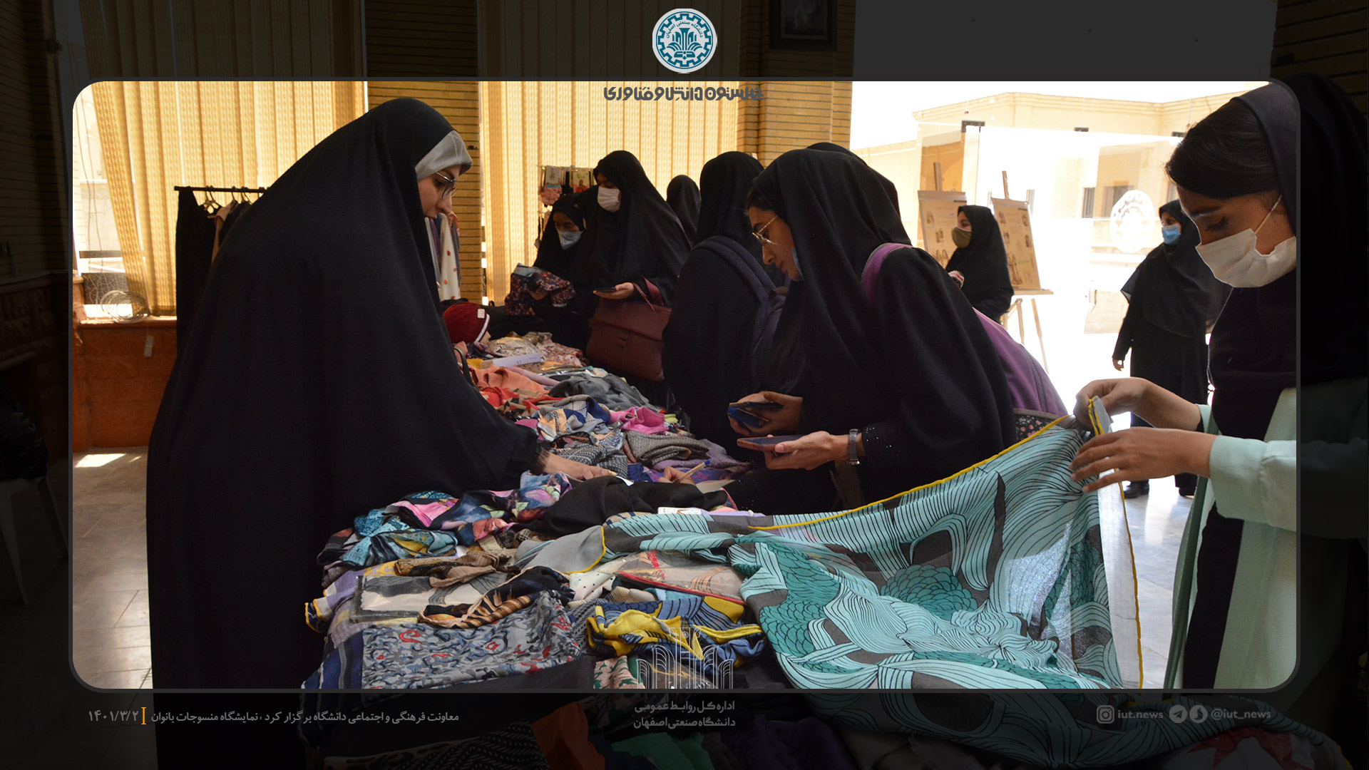 معاونت فرهنگي و اجتماعي دانشگاه صنعتي اصفهان، نمايشگاه منسوجات بانوان را با هدف ارايه پوشاك مناسب دختران و بانوان دانشگاهي،  از تاريخ 1 تا 4 خرداد ماه در سالن شهيد همت برگزاركرد. در اين نمايشگاه و فروشگاه، پوشاك فصل، مانتو، روسري، مقنعه، چادر و... باكيفيت و قيمت مناسب دانشجويي عرضه شد.