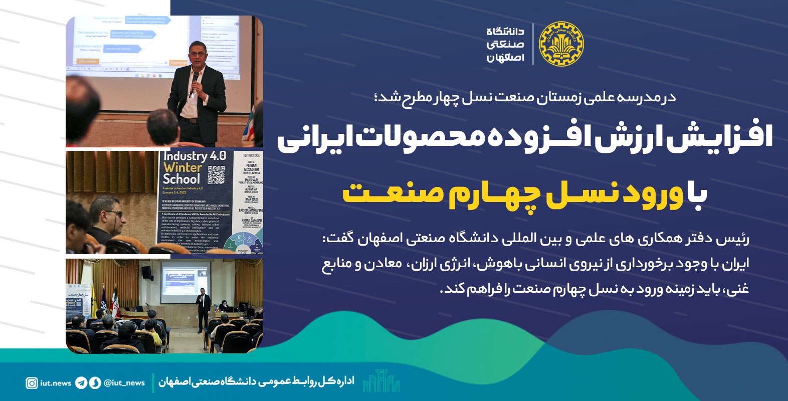 گفتنی است: مدرسه زمستانی نسل چهارم صنعت((Industry 4.0 ، به همت دفتر همکاری های علمی و بین المللی دانشگاه صنعتی اصفهان و با حضور نمایندگانی از صنایع بزرگ و دانشجویان و اساتید دانشگاه های کشور به صورت حضوری و برخط امروز و فردا در حال برگزاری است.