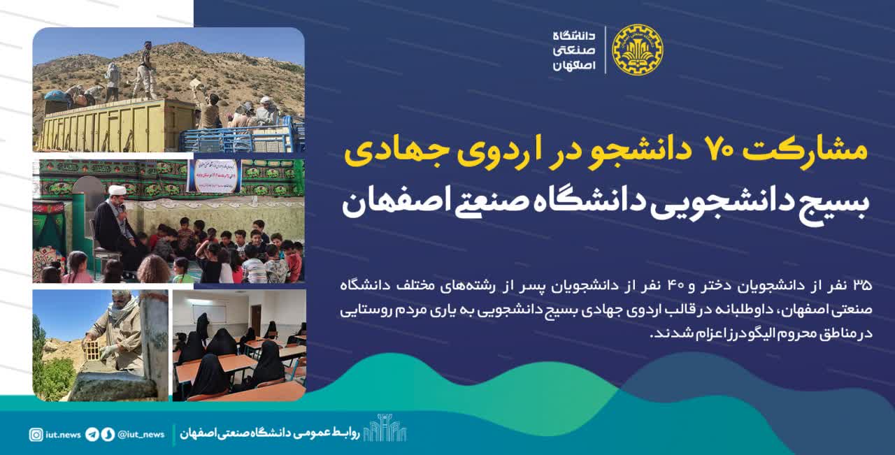 35 نفر از دانشجویان دختر و 40 نفر از دانشجویان پسر از رشته‌های مختلف دانشگاه صنعتی اصفهان، داوطلبانه در قالب اردوی جهادی بسیج دانشجویی به یاری مردم روستایی در مناطق محروم الیگودرز اعزام شدند.