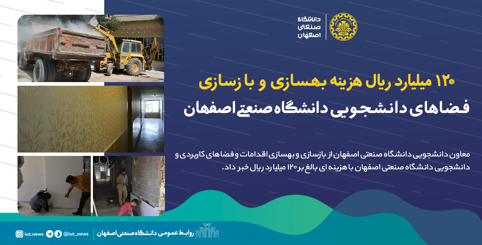 معاون دانشجویی دانشگاه صنعتی اصفهان از  بازسازی و بهسازی اقدامات و فضاهای کاربردی و دانشجویی دانشگاه صنعتی اصفهان با هزینه ای بالغ بر 120 میلیارد ریال خبر داد.