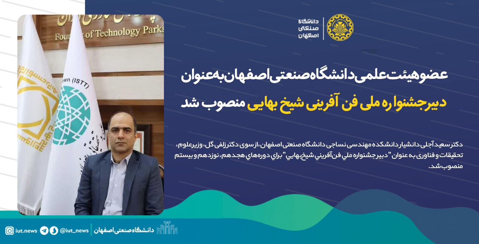 دکتر سعید آجلی دانشیار دانشکده مهندسی نساجی دانشگاه صنعتی اصفهان،از سوی دکتر زلفی گل، وزیرعلوم، تحقیقات و فناوری به عنوان 'دبير جشنواره ملي فن‌آفريني شيخ‌بهايي' براي دوره‌هاي هجدهم، نوزدهم و بيستم منصوب شد.