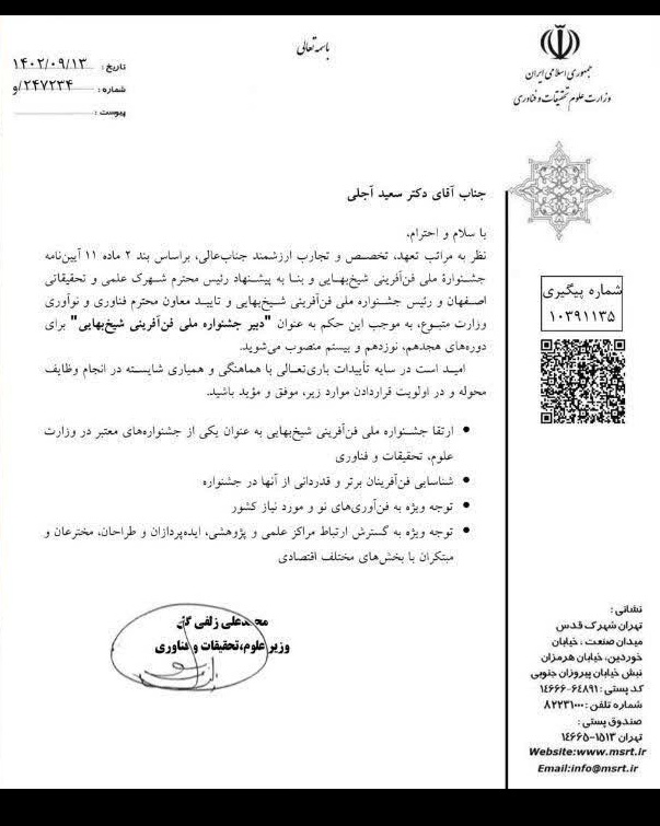از جمله مأموریت های دکتر آجلی در این حکم ارتقاء جشنواره ملی فن آفرینی شیخ بهایی به عنوان یکی از جشنواره های معتبر وزارت علوم و توجه ویژه به فناوری ها نو و مورد نیاز کشور، است. همچنین بر نقش جشنواره شیخ بهایی در توجه ویژه به گسترش ارتباط مراکز علمی و پژوهشی، ایده پردازان و طراحان، مخترعان و مبتکران با بخش های مختلف اقتصادی تأکید شده است.