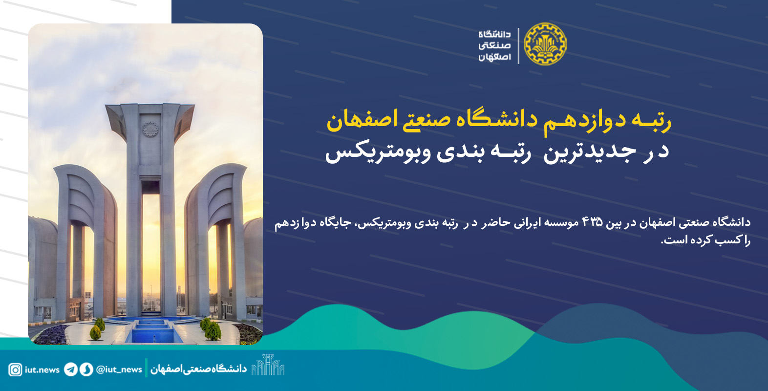 دانشگاه صنعتی اصفهان در بین 435 موسسه ایرانی حاضر در رتبه بندی وبومتریکس، جایگاه دوازدهم را کسب کرده است.