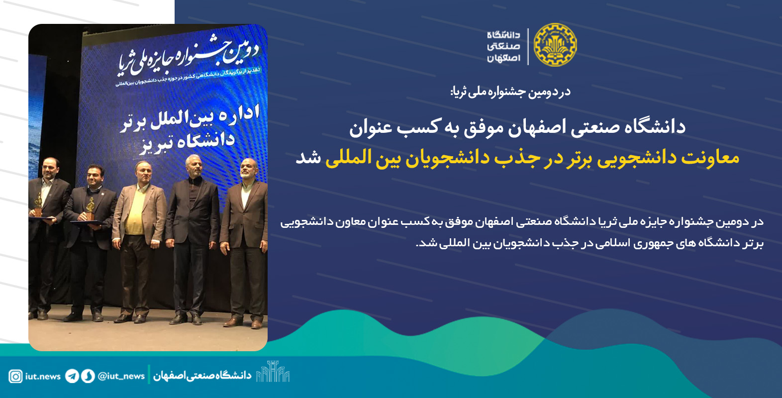 در دومین جشنواره جایزه ملی ثریا دانشگاه صنعتی اصفهان موفق به کسب عنوان معاون دانشجویی برتر دانشگاه های جمهوری اسلامی در جذب دانشجویان بین المللی شد.