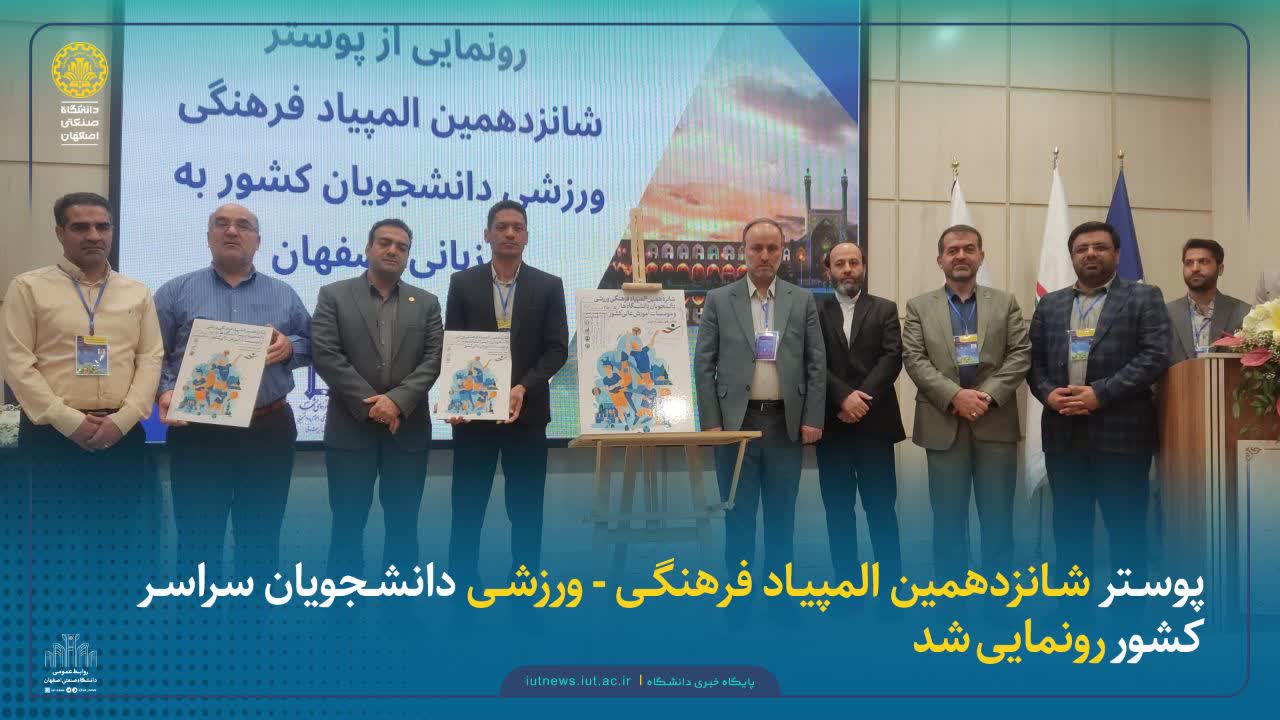 به گزارش روابط عمومی دانشگاه صنعتی اصفهان؛ همزمان با گردهمایی مدیران تربیت بدنی دانشگاه‌های کشور مراسم رونمایی از پوستر شانزدهمین المپیاد فرهنگی - ورزشی دانشجویان دختر و پسر دانشگاه‌ها و موسسات آموزش عالی کشور با حضور دکتر هاشم داداش پور معاون وزیر علوم، تحقیقات و فناوری و رئیس سازمان امور دانشجویان، دکتر ابراهیم نعیمی سرپرست معاونت امور دانشجویان داخل سازمان،دکتر سردار اصلانی معاون دانشجویی دانشگاه اصفهان، دکتر مجتبی بابایی خورزوقی معاون دانشجویی دانشگاه صنعتی اصفهان، دکتر ابراهیم علی دوست مدیر کل تربیت بدنی سازمان امور دانشجویان و مدیران تربیت بدنی دانشگاه‌های میزبان برگزار شد.